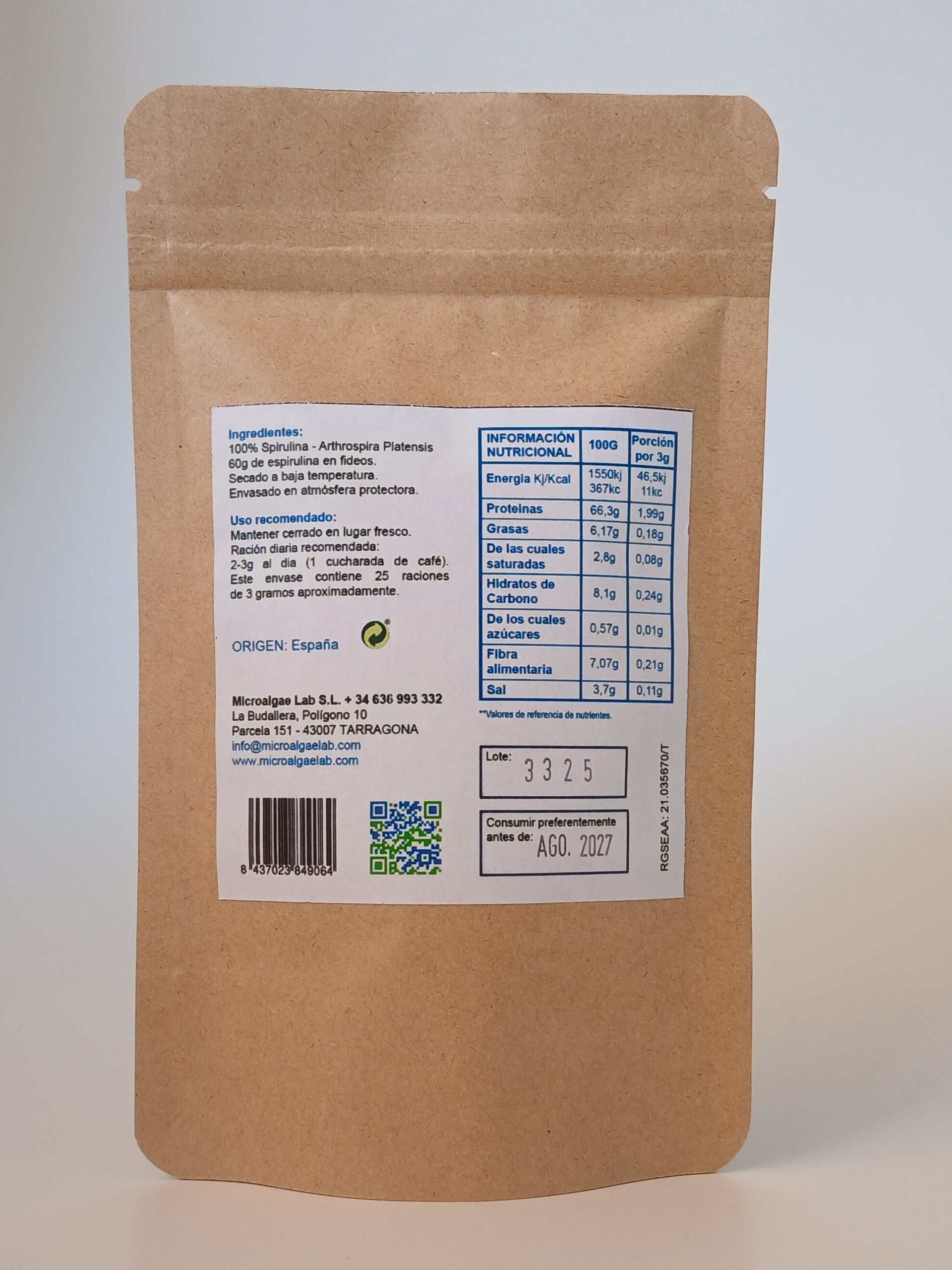 Amb un procés d'assecat mitjançant deshidratació a temperatura ambient, per conservar les excel·lents propietats que ens ofereix la espirulina, i són envasats en atmosfera controlada per a la seva bona conservació.