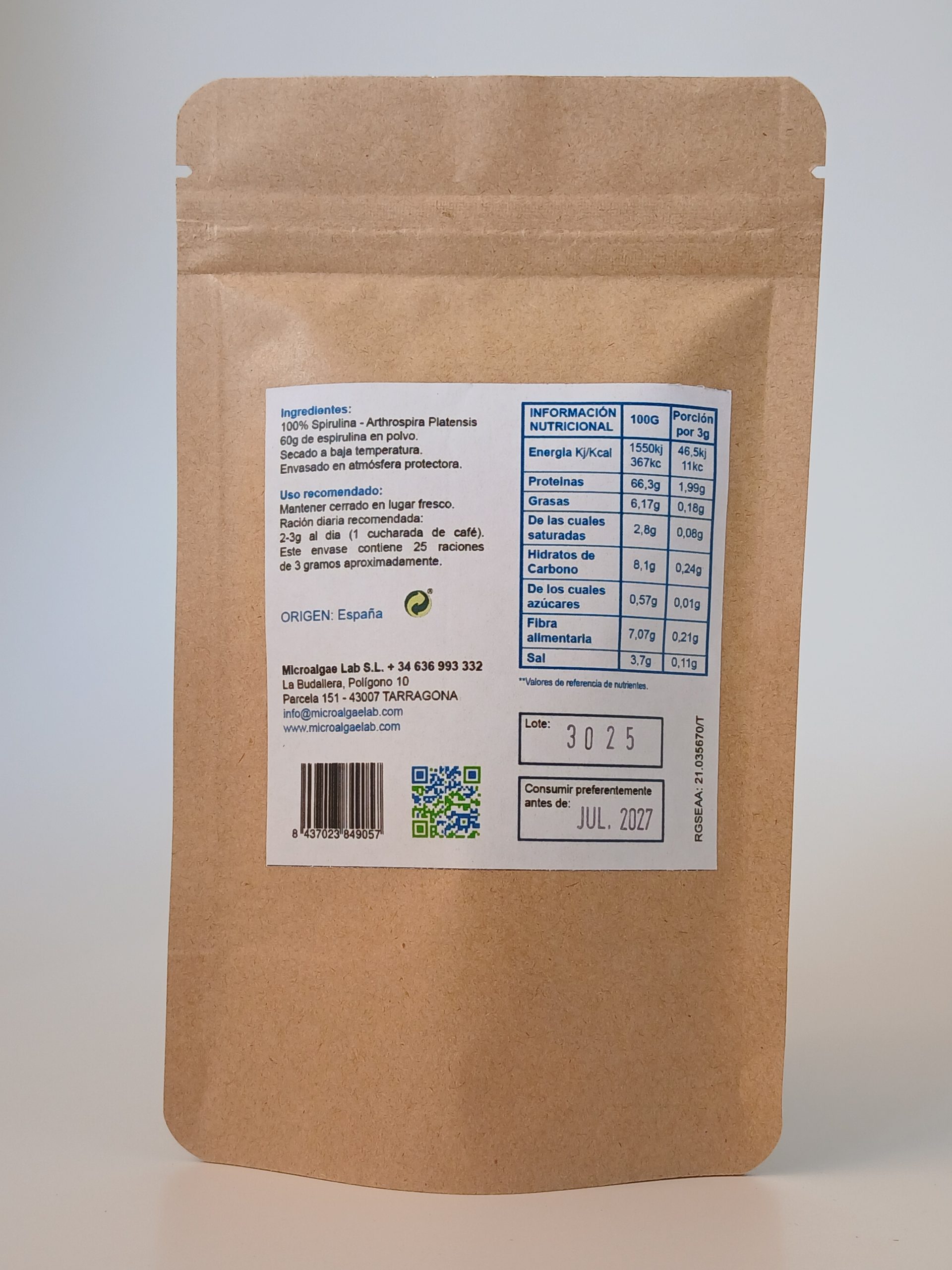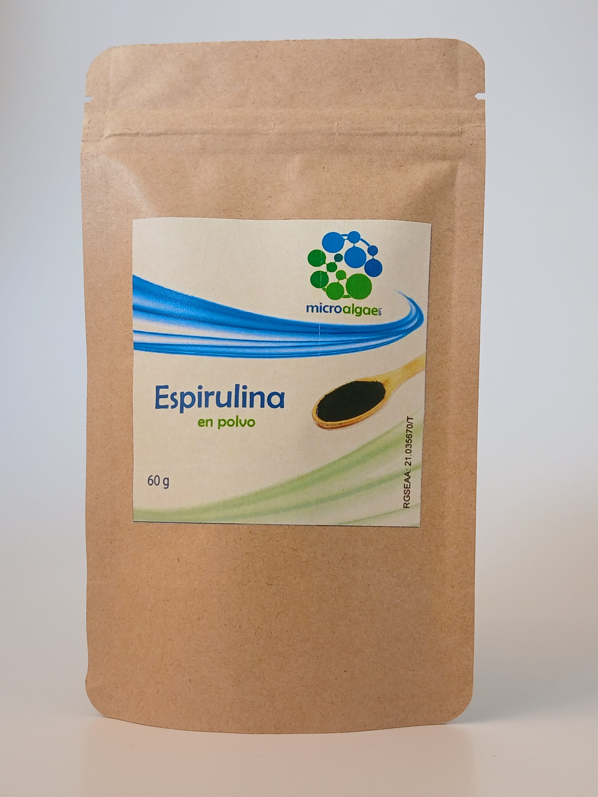 Amb un procés d'assecat mitjançant deshidratació a temperatura ambient, per conservar les excel·lents propietats que ens ofereix. El pols s'obté a partir dels fideus d'espirulina deshidratada, aquests fideus es trituren per aconseguir el pols, i són envasats en atmosfera controlada per a la seva bona conservació.